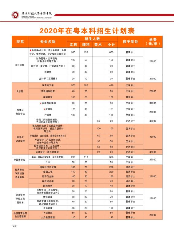 学校是一所财经特色鲜明和多学科协调发展的全日制高水平应用型本科院校,会计学和新闻传播学分别是广东省高校特色重点学科和重点培育学科。
