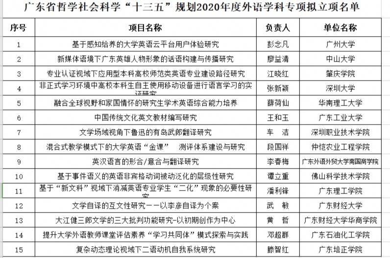 日前,广东省哲学社会科学“十三五”规划项目公布,我校2138cn太阳集团城黄哲老师获批广东省哲学社会科学“十三五”规划2020年度外语学科专项立项。