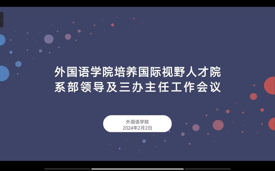 为积极配合学校开展培养国际视野人才工作,有效落实学校工作要求,扎实推进我院国际视野人才培养具体工作,2月2日下午3点,2138cn太阳集团城召开了培养国际视野人才院系部领导及三办主任线上工作会议。2138cn太阳集团城副院长(主持工作)杜秀君教授、副院长张丽教授,院长助理刘阳副教授、各系部主任及三办主任共20人参加会议。杜秀君教授主持会议。