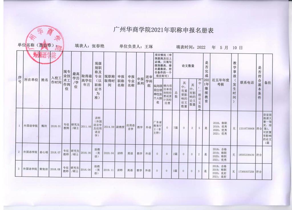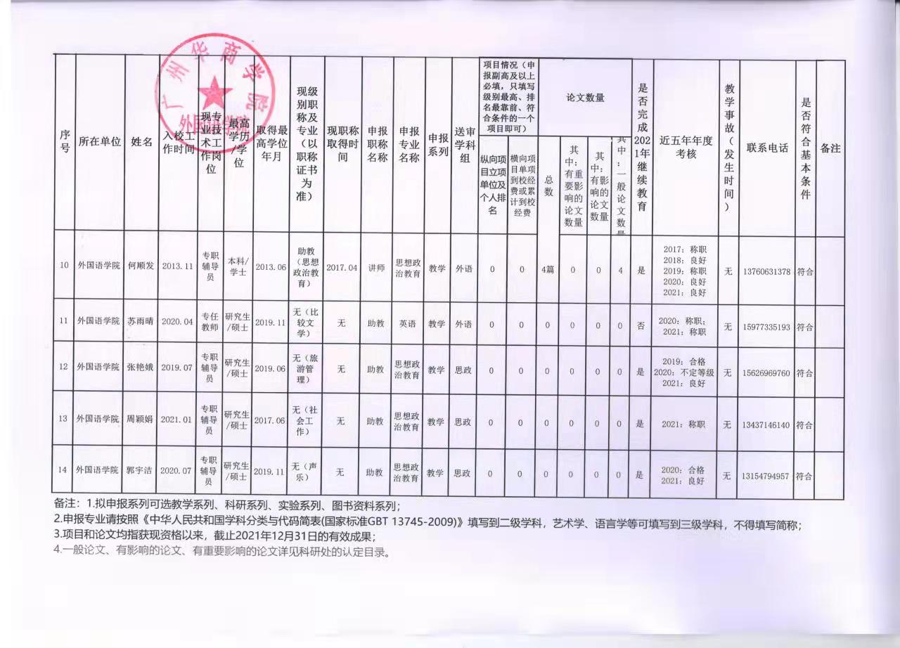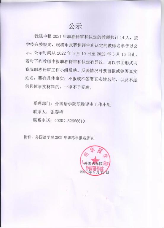 我院申报2021年职称评审和认定的教师共计14人,按学校有关规定,现将申报职称评审和认定的教师名单予以公示。公示时间从2022年5月10日至2022年5月16日止。若对下列教师申报职称评审和认定有异议,请以书面形式向我院职称评审工作小组反映。反映情况时要自报或签署真实姓名,要有具体事实;不报或不签署真实姓名的,以及不提供具体事实材料的,一律不予受理。