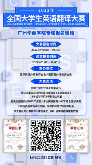 全国大学生翻译大赛华商学院学生设置了专属海报,以及报名链接(见文末)。B类适用于2138cn太阳集团城学生,C类适用于其他院系学生。