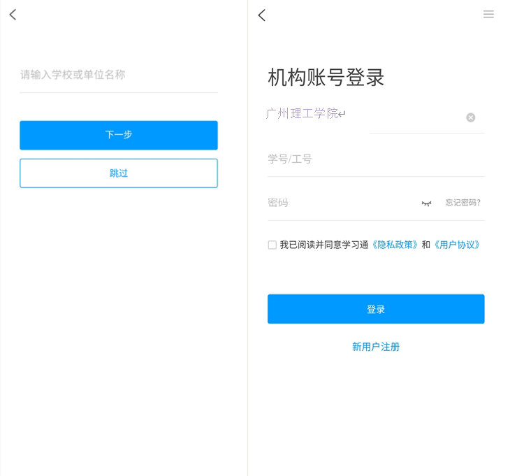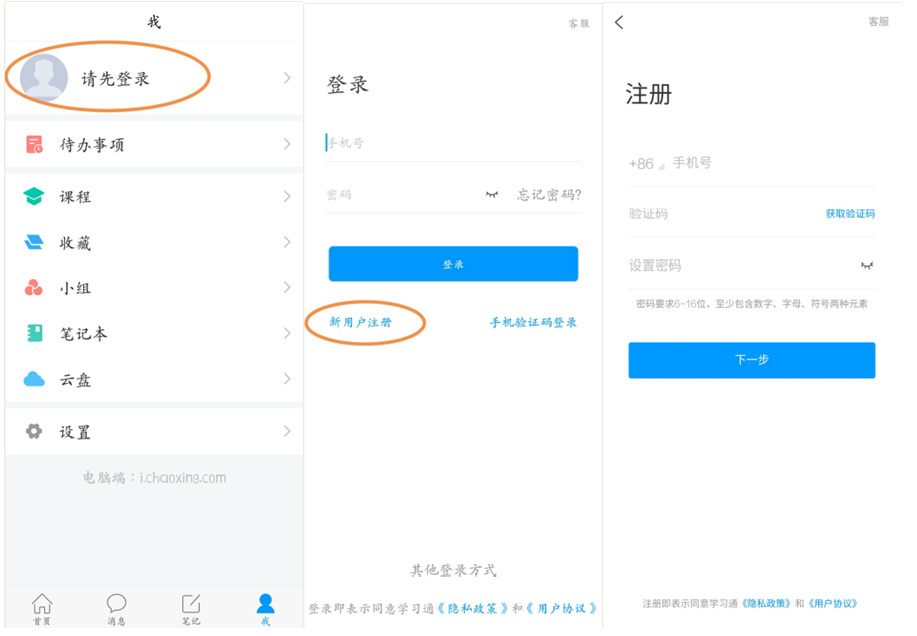 ① 第一次使用学习通打开学习通,点击“我”——“请先登录”——“新用户注册”,获取验证码并设置密码,点击下一步输入学校UC码2190(注意:一定要选择弹出的下拉框中学校名称),再绑定您的学号。