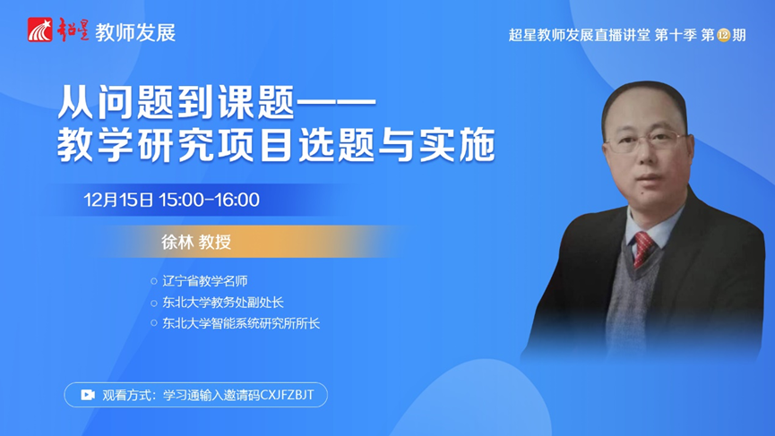教学研究是推进高等教育高质量内涵建设的重要工作之一。高校教师应如何实现教学问题到教学研究课题的转化?针对教学研究的选题与实施,超星教师发展直播讲堂第十季第12期特邀东北大学教务处副处长徐林教授,以真实教改项目为例,从项目运行的全流程讲解教学研究路径。