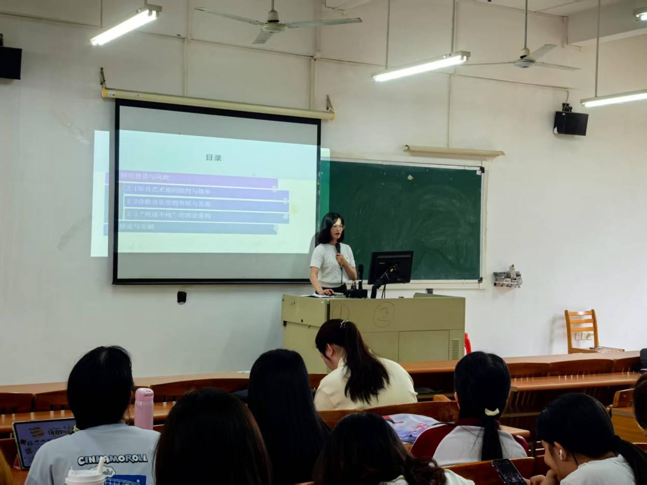 优美的诗句如同涓涓流水淌入同学们的心中,配合章晓宇教授标准且优美的诗朗诵语调,让同学们如同进入到了莎翁所处的时代。章教授讲述了审丑艺术观的批判与继承,艾略特诗学既是法国象征主义的折射,也是其对法国象征主义反思和发展的批评,主要在审丑意象维度表现为一种更客观更广阔的与"恶"争锋的审丑观。章晓宇教授还进一步阐述了诗歌音乐性的突破与发展以及“纯诗不纯”的理论重构,章教授解释,艾略特诗学在音乐性维度表现为声音,意义不可分割的整体性音乐观;在纯诗观维度上,又表现为一种诗歌语言,诗歌主题,诗歌技巧均不"纯粹"的纯诗观。